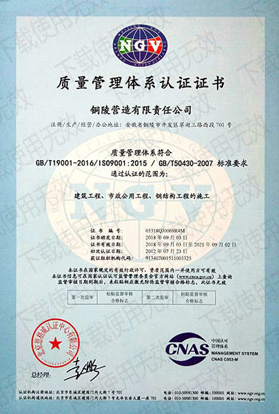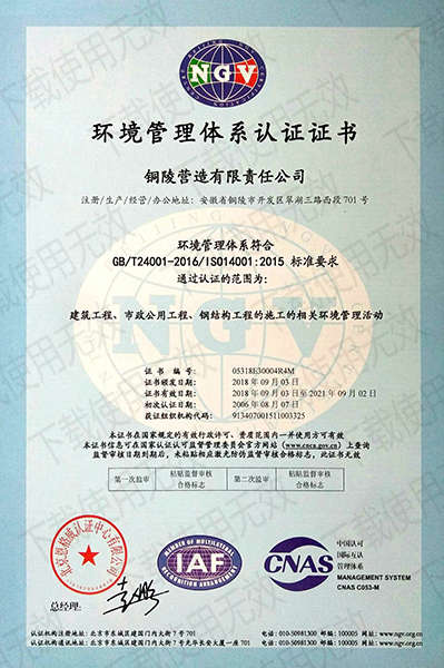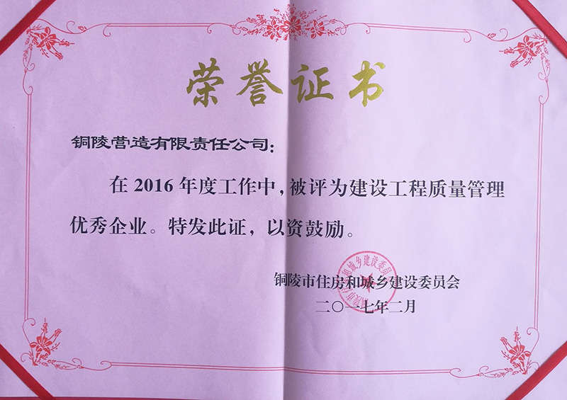 銅陵營造有限責任公司是國家住建部核準的房屋建筑總承包一級企業(yè)。2006年7月,企業(yè)二次改制為民營企業(yè),并更名為“銅陵營造有限責任公司”。目前,公司擁有房建施工總承包、市政公用工程總承包、鋼結(jié)構(gòu)專業(yè)工程承包、建筑裝修裝飾專業(yè)工程承包四項壹級資質(zhì),機電安裝、起重設備安裝、建筑幕墻三項貳級資質(zhì),地基與基礎一項叁級資質(zhì)。2008年通過北京恩格威ISO9001、ISO14001和OHSAS18001“三合一”體系認證。